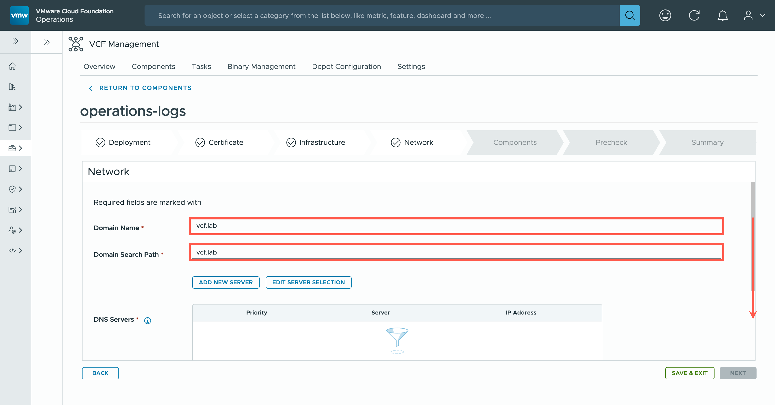 13. At the Network page, at the Domain Name and Domain Search Path fields, type vcf.lab.