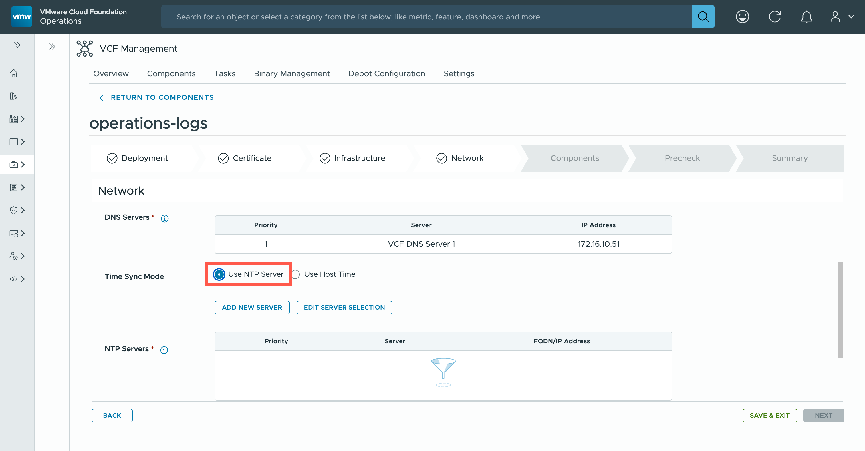 17. At the Network page, scroll down and then, under the Time Sync Mode options, select the Use NTP Server option.