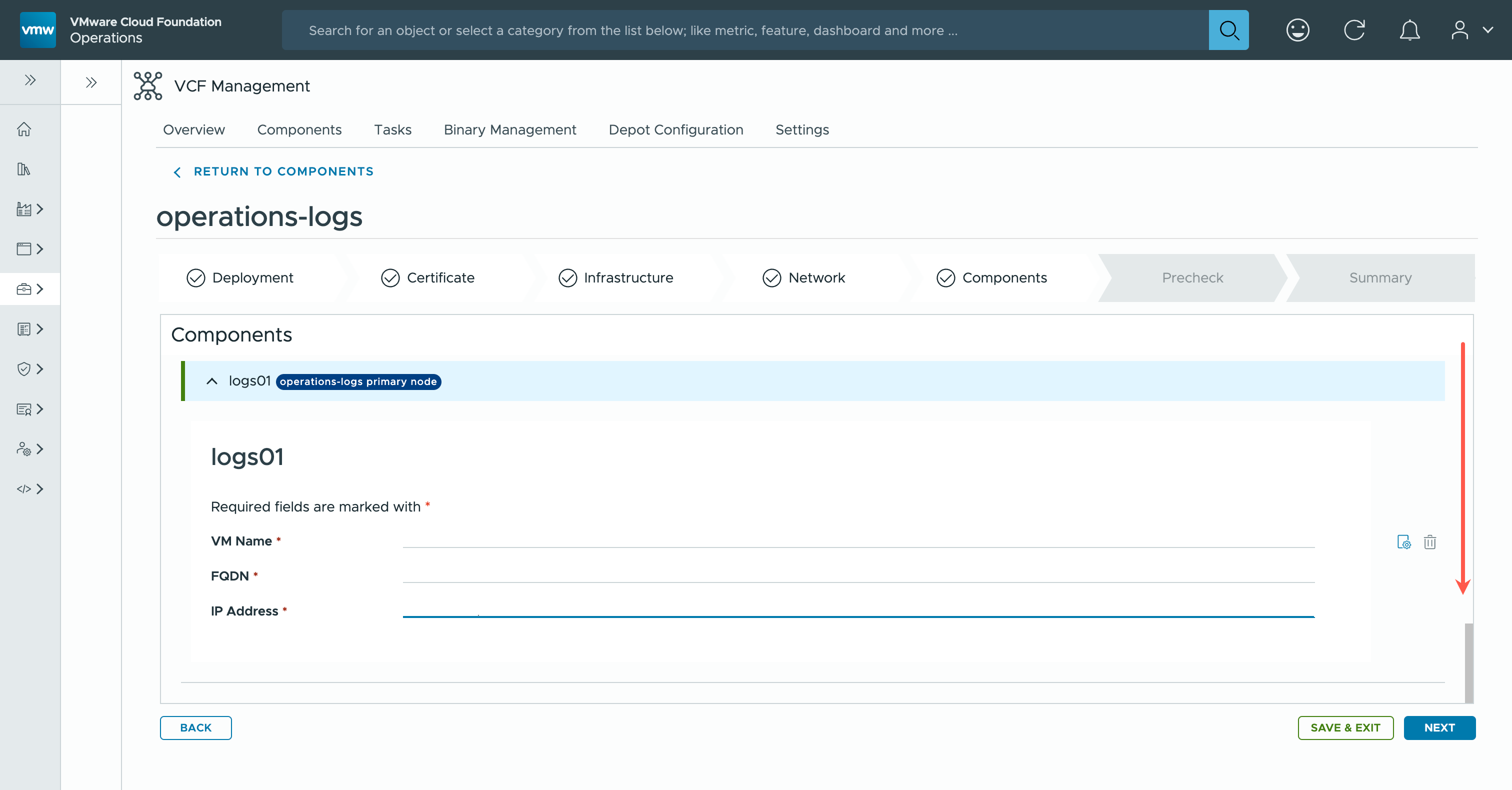 30. At the Components page, for each of the appliances type the <vm.name> into the VM Name field, type the <vm.fqdn> into the FQDN field and the <vm.ip> into the IP Address field.