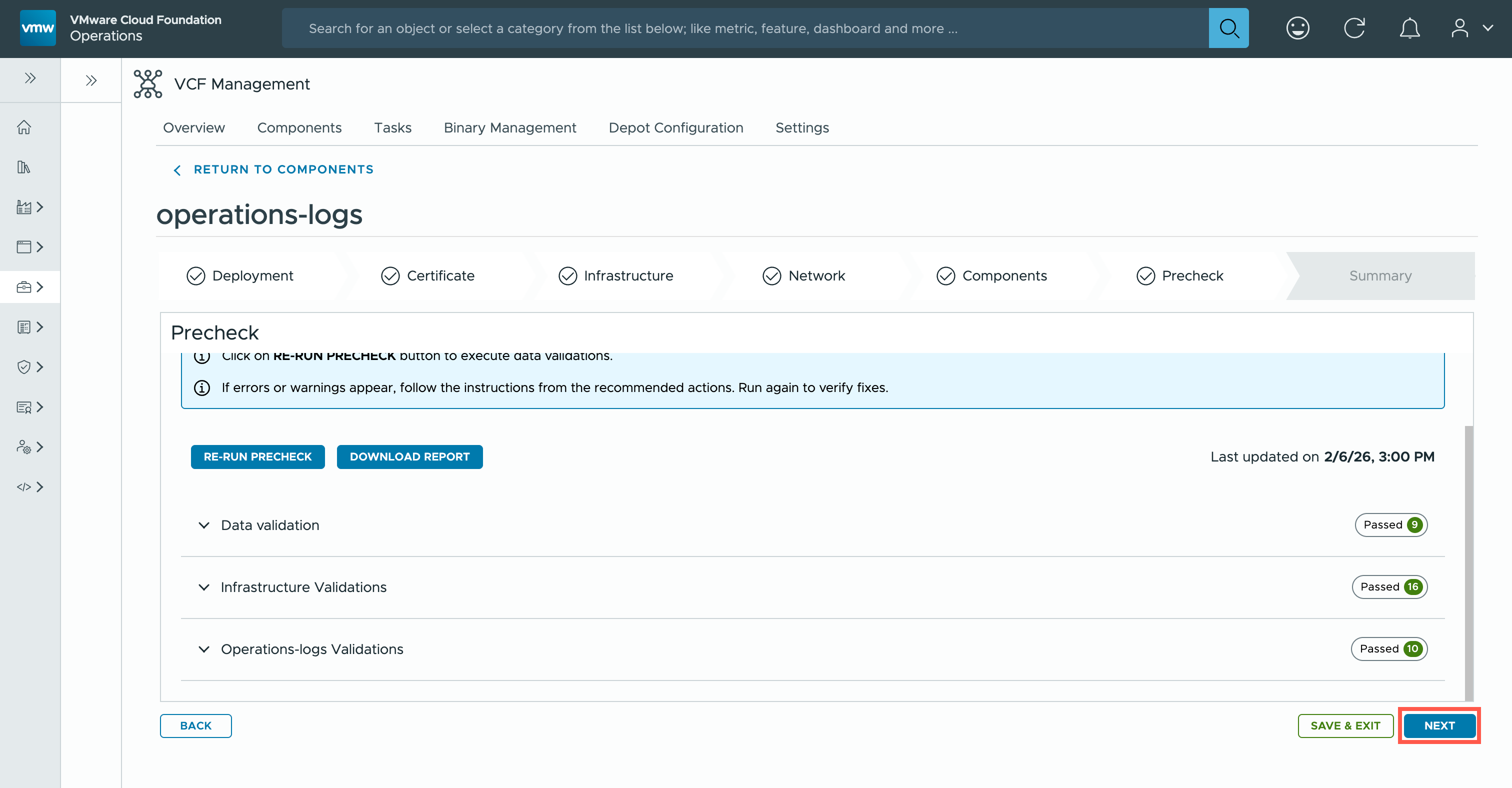 33. At the Precheck page, assuming all pre-checks are passed, click NEXT.