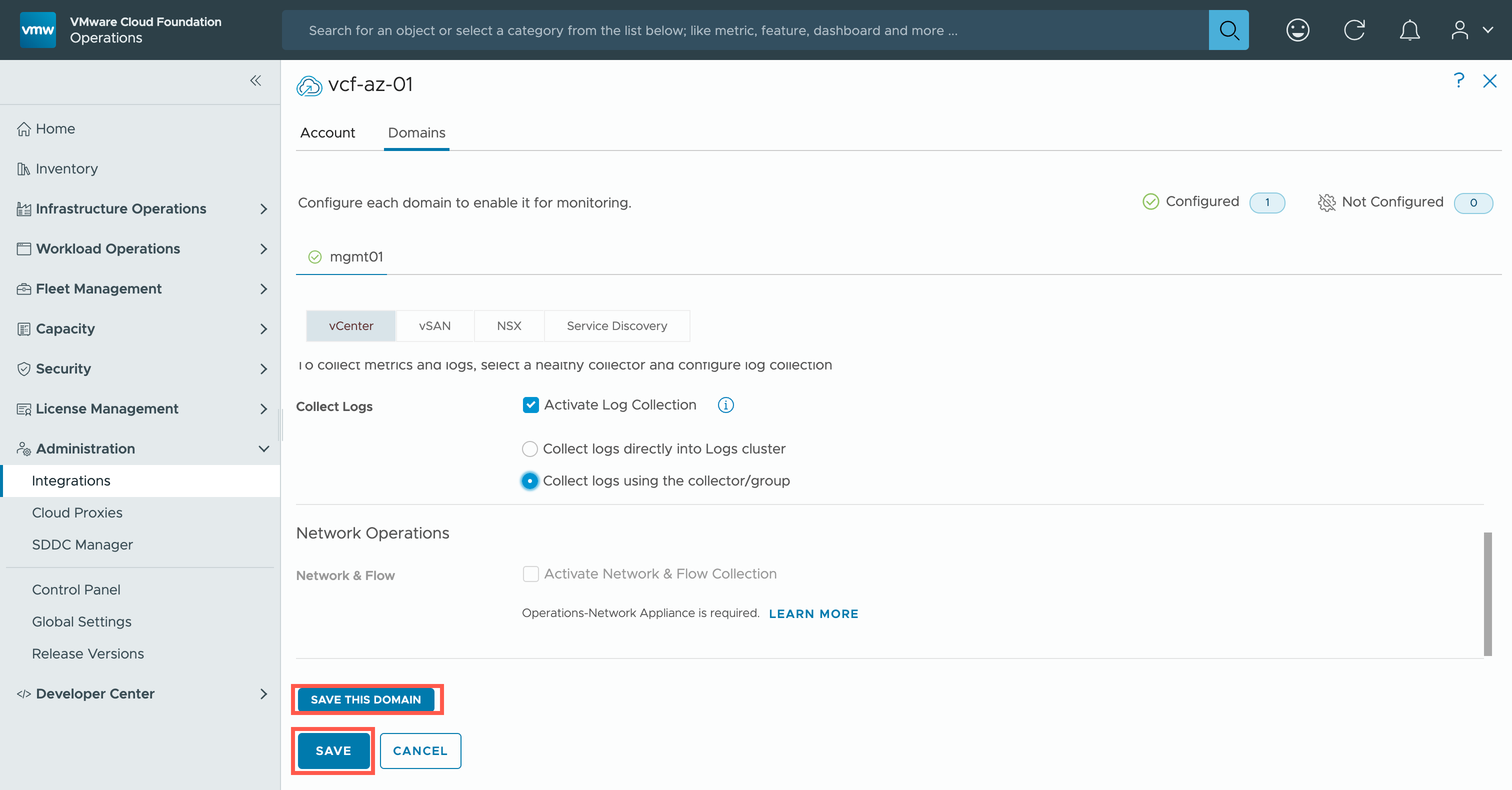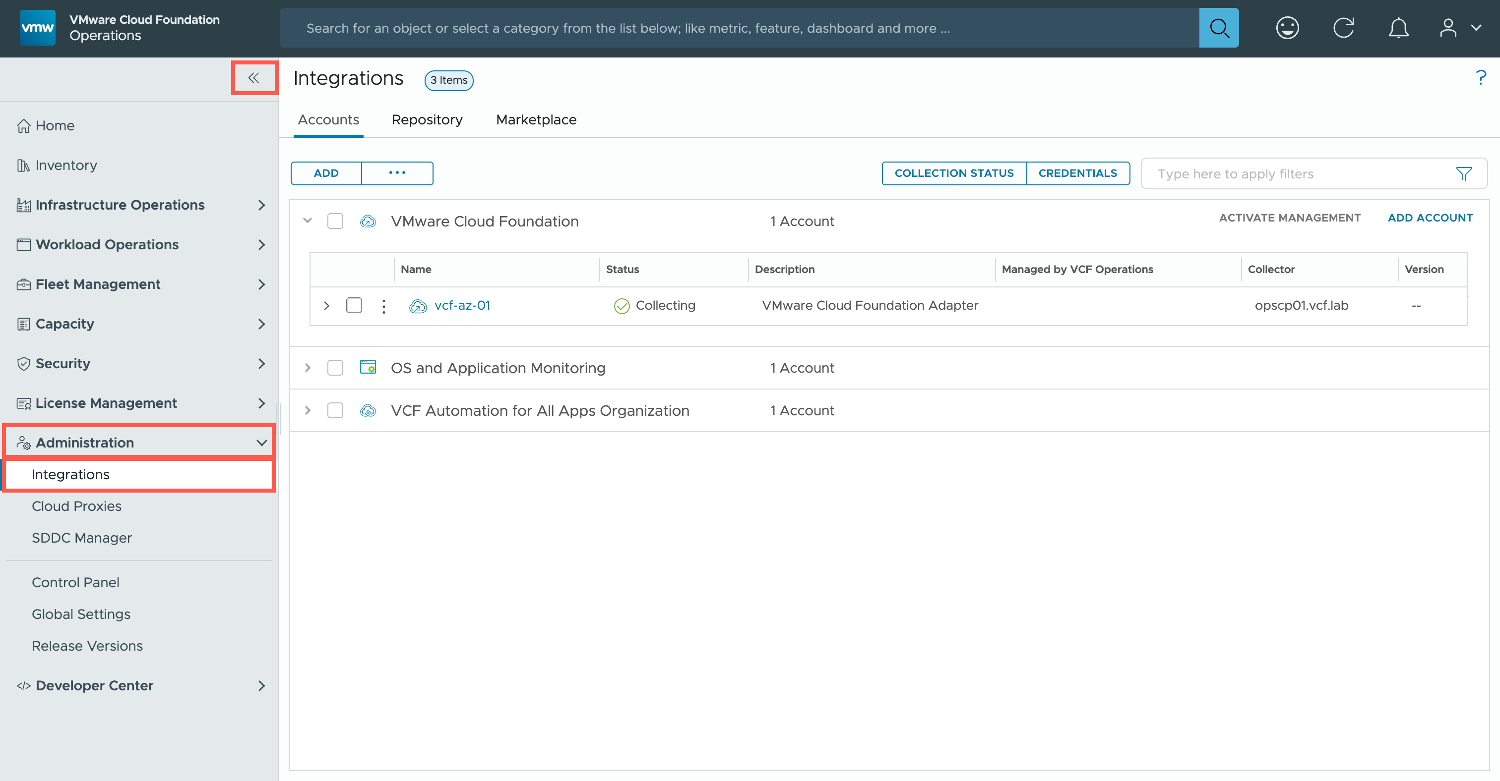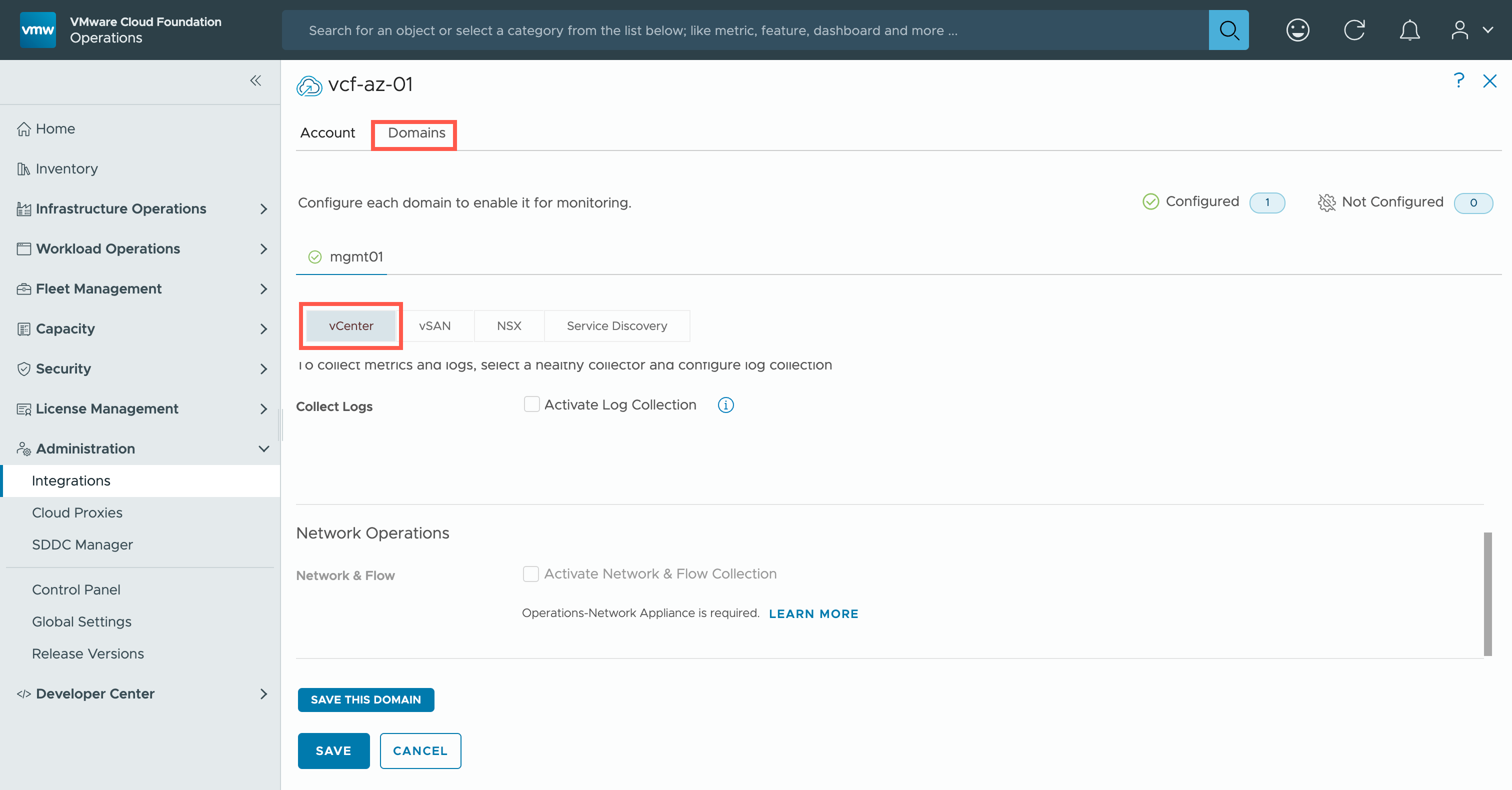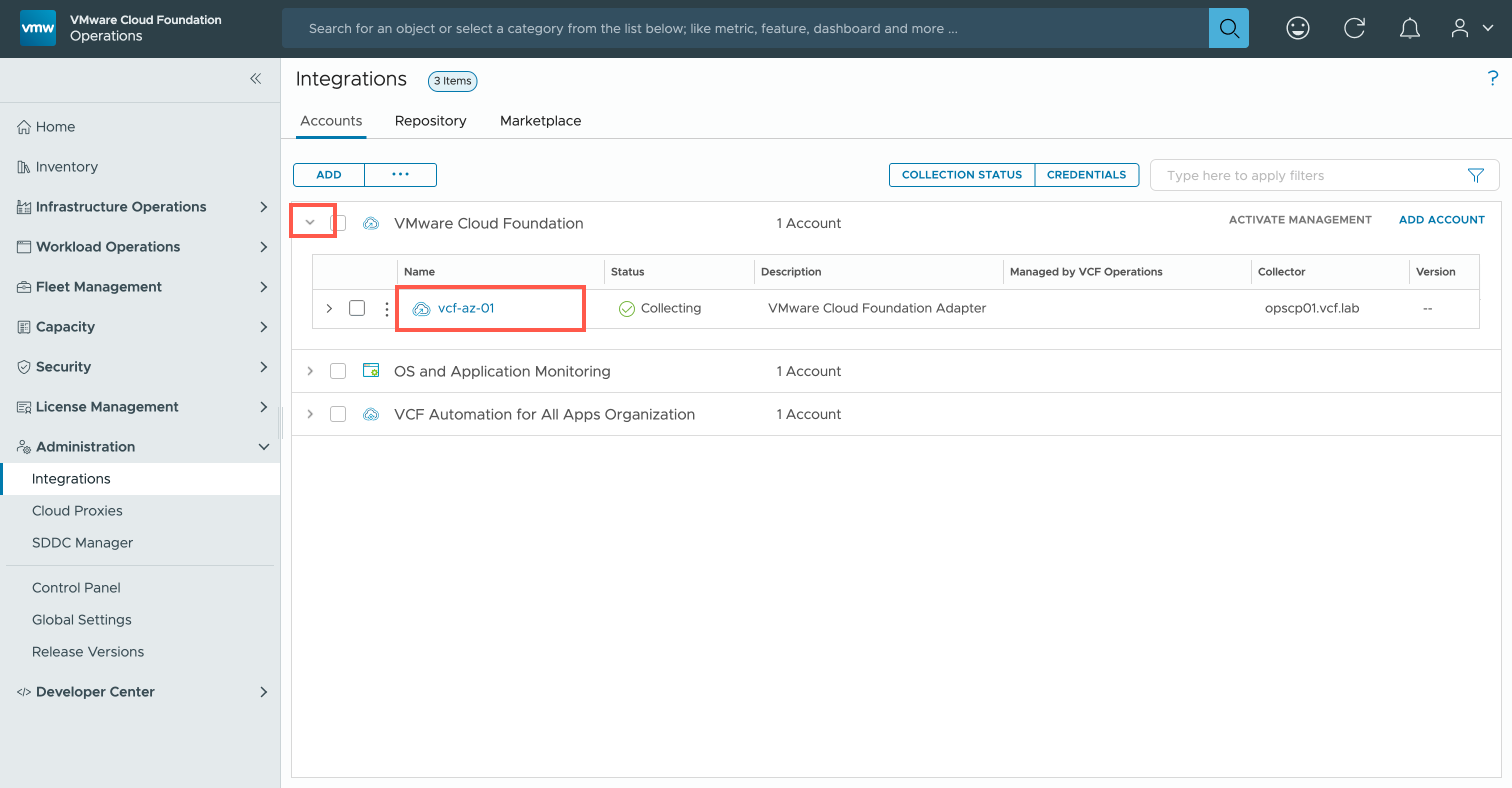 2. At the Integrations page, expand VMware Cloud Foundation integrations by clicking > and then click <wld.name>.